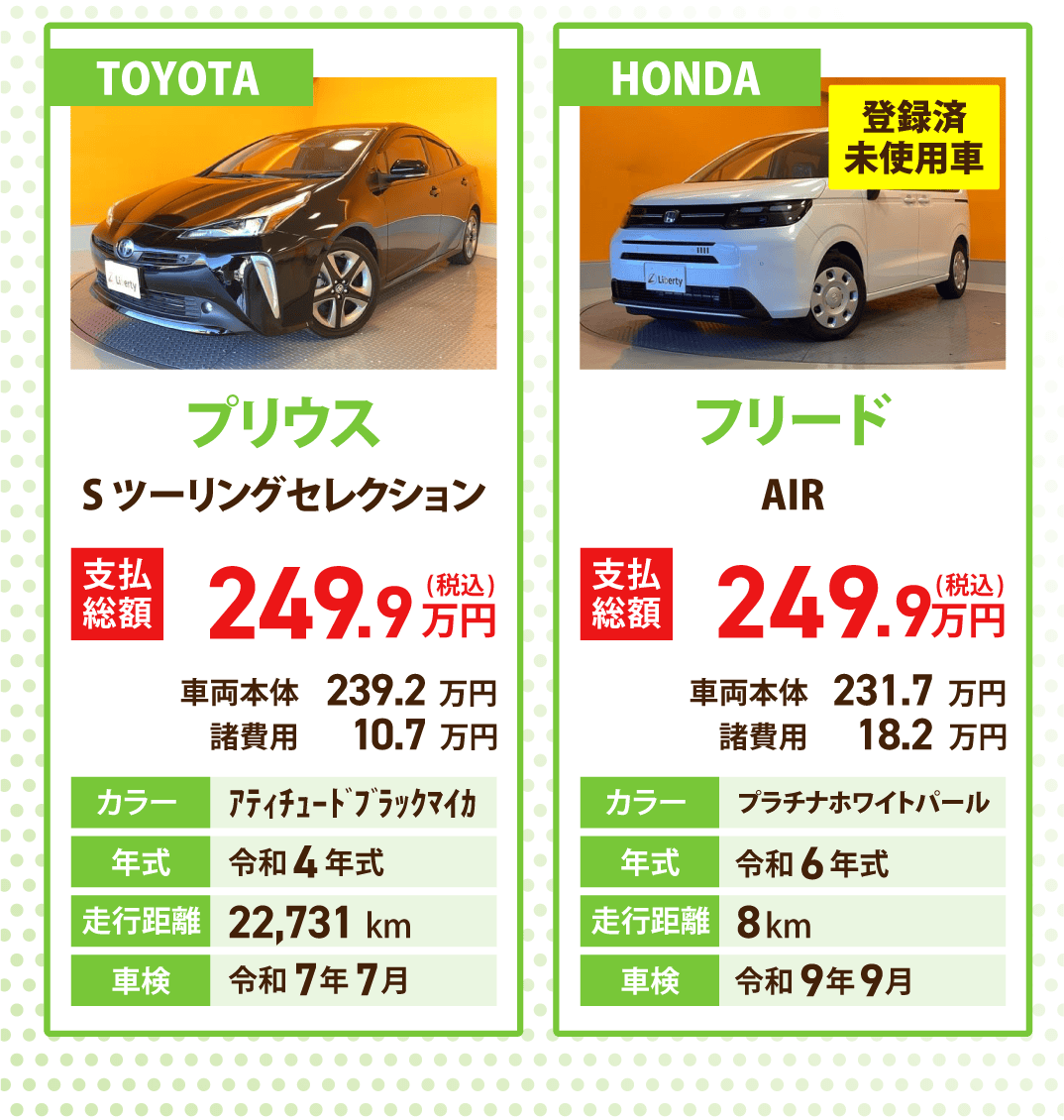 リバティはグループ全店でオールメーカー6,000台の豊富な在庫があります。全店舗からお近くのお店へ取り寄せOK!在庫にない車は仕入れることも可能です。※取り寄せは陸送費が必要になります